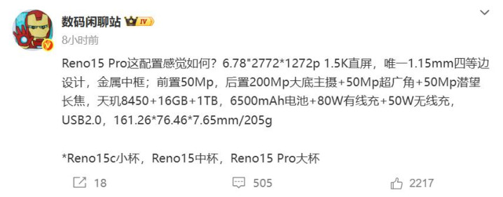 oppo这次的reno 15系列新品感觉主打标准版,做成小直屏配置还大幅提升,反倒pro版却没有怎么提升,处理器还是天玑8450,不过在细节、电池、外围等方面会更强,同样有一定的优势。